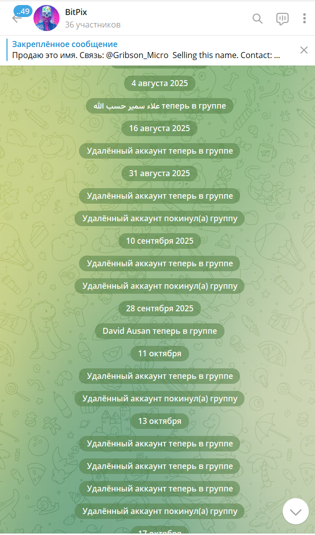 У меня завалялось публичное имя в телеграм - @bitpix. Раньше был канал в телеге про киберпанк и технологии, и это было имя для публичного чата “Битый Пиксель”. Ну не суть. В этот уже мертвый без канала чат иногда вступали всякие индусы, арабы и вообще не пойми кто.