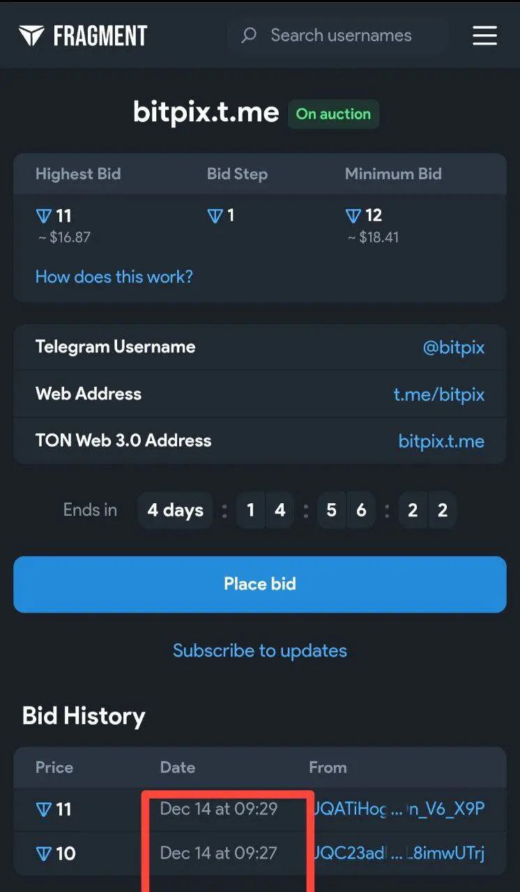 Аукцион запустился, жду. Мою ставку перебили спустя 2 мин. Я предполагаю, что действовал снайпер-бот. Выполнил анализ на основе нейронки, которая ему, как и мне сказала что имя условно ценное и он через API “выстрелил” сделав ставку 11TON.